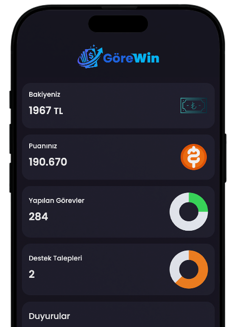 Sosyal medya ve dijital platformlardaki görevleri tek yerden tamamla. GöreWin, farklı platformları tek bir görev sisteminde buluşturur; sen sadece görevi yap, kazancını kazan.